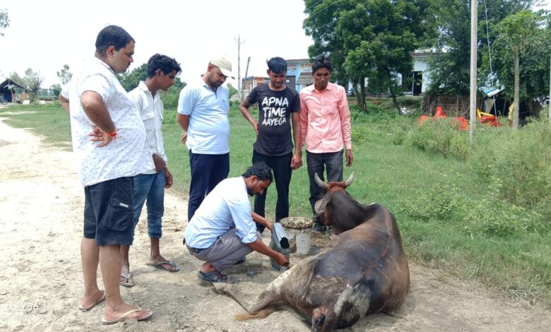 अज्ञात वाहन से घायल गाय को ग्रामीण की मदद से डॉक्टर को सूचना देकर करवाया इलाज
